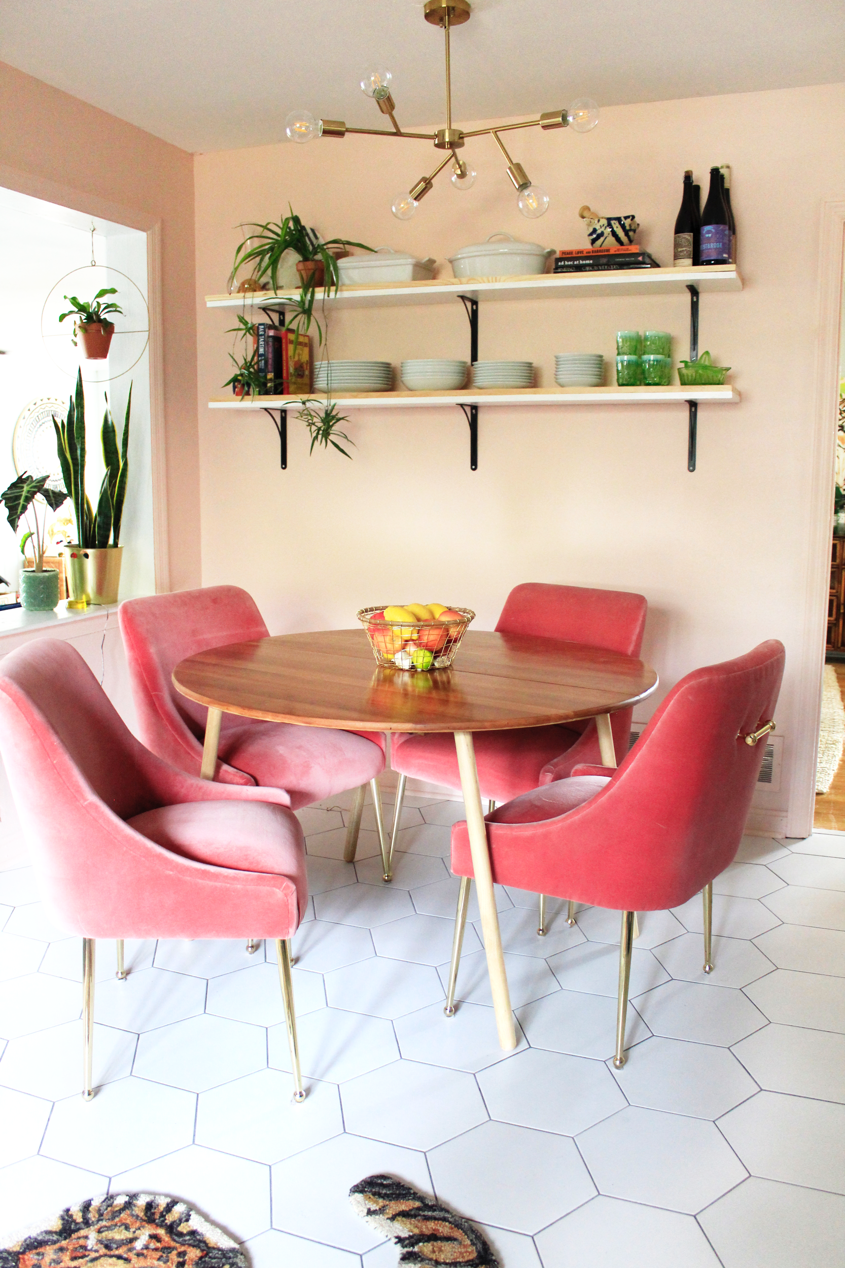Light Fixture | Chairs (Similar) | Wall Planter | Faucet (Similar) | Drawer Pulls | Cabinet Knobs | Rug | Pink Le Creuset | Soap Bottles | Celfie Planter | Salt Well